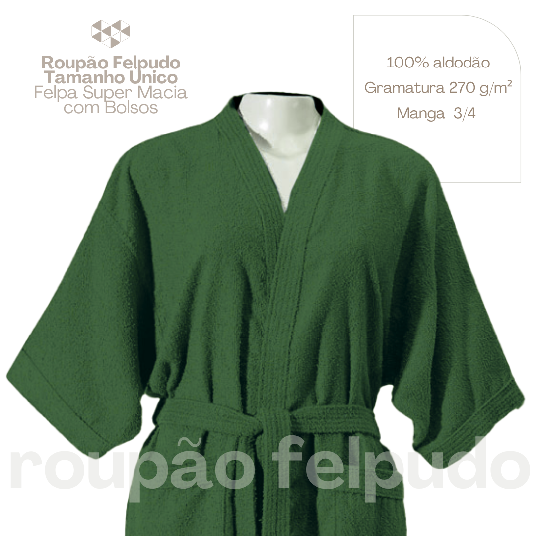 Esse roupão é produzido em tecido felpudo de toque macio e grande capacidade de absorção. Disponível para uso adulto em tamanho único.